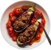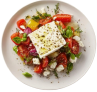 A fresh mix of cucumbers, olives, feta, and tomatoes drizzled.